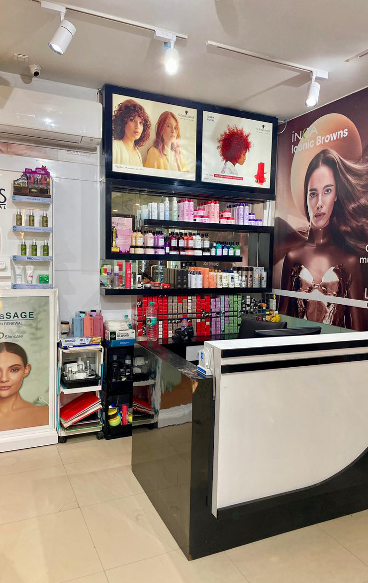 Visit our salon at Axis Mall for expert service in haircuts, colour, treatments, makeup, and more. We look forward to welcoming you!